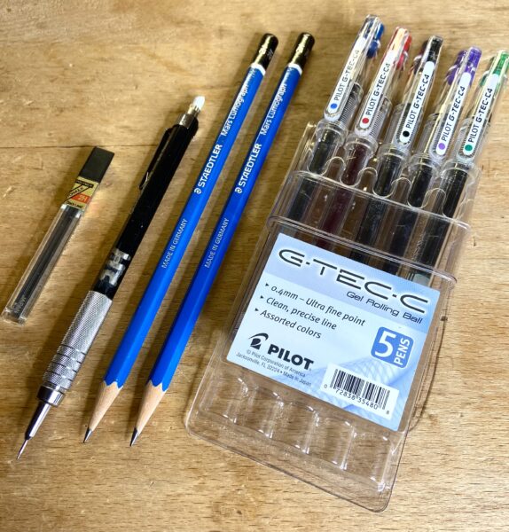 The ultra-fine 0.4mm gel rolling pens (Pilot) are for those occasional times where you want to go directly over the main pencil lines to finalize a drawing. (Of course, there is no going back!) This will make it easier to see the main components as it is hanging on the board in front of the workbench.