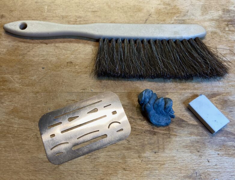 Sometimes I will use the small eraser on the top of the mechanical pencil, especially in tiny areas to erase. For most erasing, I use the white polymer/vinyl rectangle. It erases more easily than the grey kneaded eraser but it does make particle dust. That needs to brushed away with the soft, light brush. You can blow away the dust but it is a pain in the neck to get rid of it all. The same goes for just brushing it away with your hand.