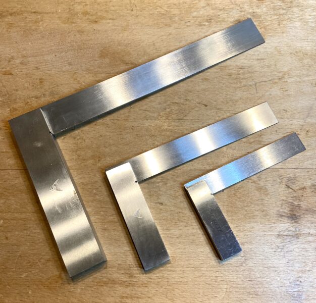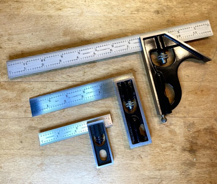 The other set of squares that I have are the solid machinist type. The very useful set of three is the 9”, 6”, and 4”. These are more convenient and faster to handle than the combination squares for stock preparation and some joinery. For this type of square, the highly accurate Starrett machinist squares are unnecessarily accurate and expensive.