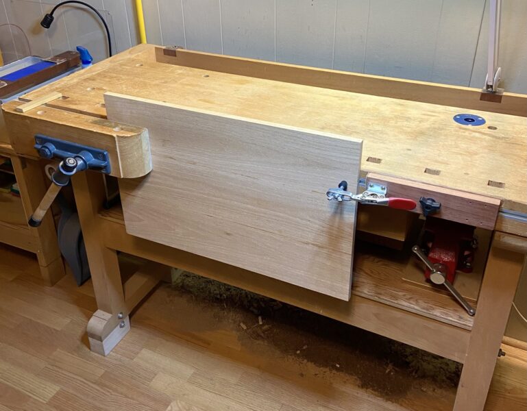 Let us continue with the previous post. If the wide piece of wood being held in the front vice is also fairly long, we need a second system that grips the right side of it. Otherwise, it will tend to slip down due to weight, especially pressure from planing the edge straight and square with a #5 or #7.