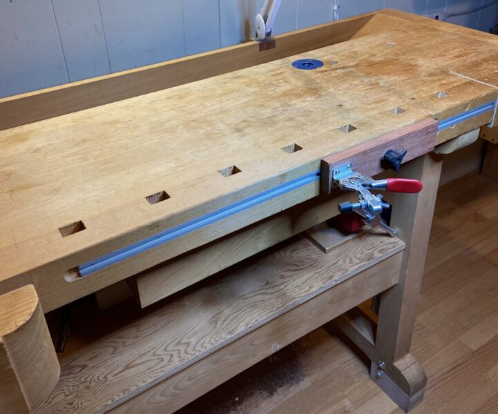 There is an aluminum T-track (“T-slot track”) (3/4” wide x 3/8” deep) screwed into a slot in the bench top made with a router bit. A small space on the left side of the slot allows you to easily enter the clamping device. The slot is not extended into the opening for the right-sided bench vice. The T-track never interferes with any other use of the workbench.