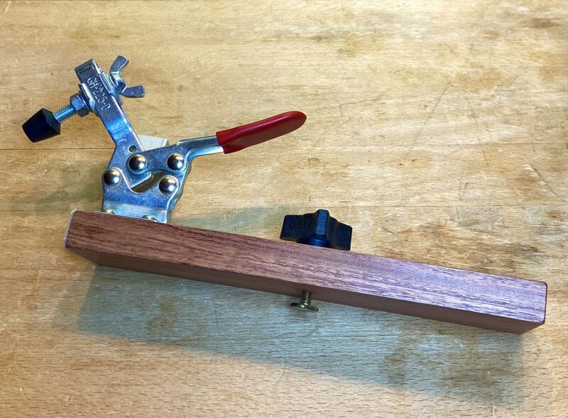The workpiece is held with a quick-release toggle clamp with an anti-slip tip. It is attached with four screws on a sturdy piece of hardwood 3/4” x 10” x 2 1/4”. The toggle clamp is screwed in near the end of the wood piece.